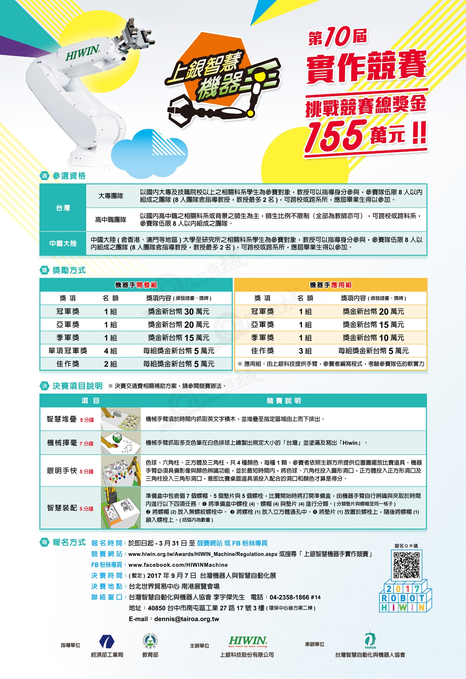 因此,上銀科技決定于第九屆開始調整賽制,將競賽分為兩個組別 1.機器手開發組 2. 機器手應用組,除保留原有機器手實作競賽外,另增加一組由上銀科技提供手臂,參賽者編寫程序,考驗參賽隊伍的軟實力。本活動為激發與鼓勵國內學生針對機器手臂研發及創意應用發展,希望透過競賽方式發掘相關產業人才,有效促進產學合作。