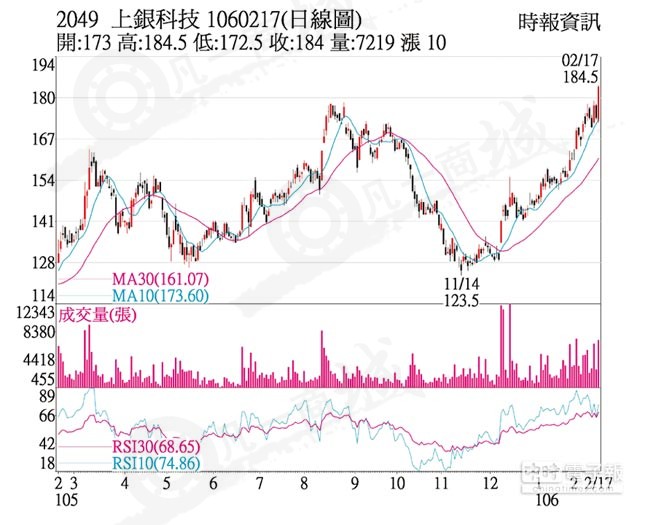 上銀大廠(2049)拜大陸對智慧自動化及工業用機器人需求持續暢旺所賜,上半年訂單滿手,2月持續加班趕工,市場預期2月營收超越去年同期8.45億元,上看10億元,外資及自營商17日合計買超3,888張,推升股價以184元作收,上漲10元,創2015年11月以來新高。