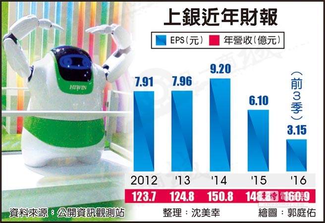 上銀大廠(2049)去年因上銀滾珠螺桿、上銀直線導軌及上銀機器人三大主力產品,因大陸對自動化設備及機器人需求持續增溫而受惠,自結去年12月合并營收攀升至15.71億元,創下單月新高,去年合并營收160.95億元,創歷史新高。上銀今年首季訂單滿載,能見度看到第2季,今年業績可望超越去年。