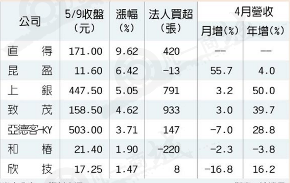 智慧機械題材再度熱炒,搭上4月營收業績揭露,指標股上銀科技、亞德客分別年增50%、28.8%,上銀創下歷史新高,帶動機器人概念股多頭點火,直得科技一度攻上漲停、大漲9.62%,上銀、亞德客都漲逾3%。