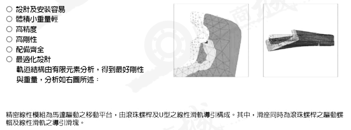 2)體積小重量輕: U型軌道可當導引軌道,亦用搭平臺結構,大幅縮小安裝體積,并以有限元素法設計出最佳化結構,得到最佳剛性與重量比例。低扭力與低慣量的平順定位運動,可減少能源耗用。