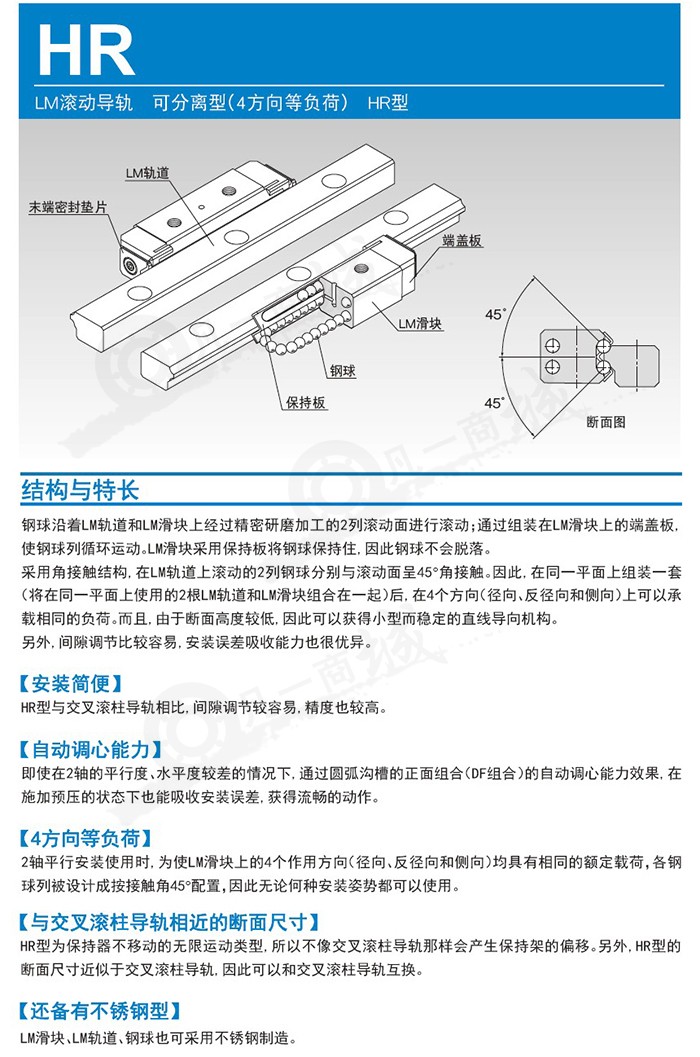 鋼球沿著LM軌道和LM滑塊上經過精密研磨加工的2列滾動面進行滾動;通過組裝在LM滑塊上的回球器,使鋼球列循環運動。