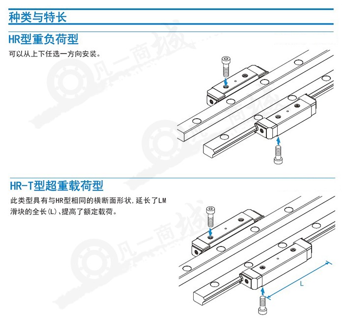 HR型為保持器不移動的無限運動類型,所以不像交叉滾柱導軌那樣會產生保持架的偏移。另外,HR型的斷面尺寸近似于交叉滾柱導軌,因此可以和交叉滾柱導軌互換。