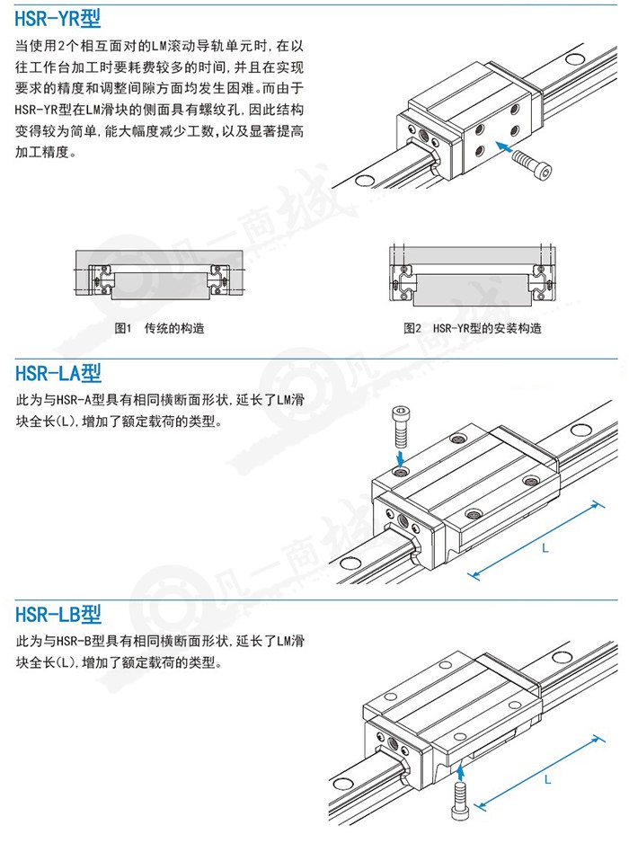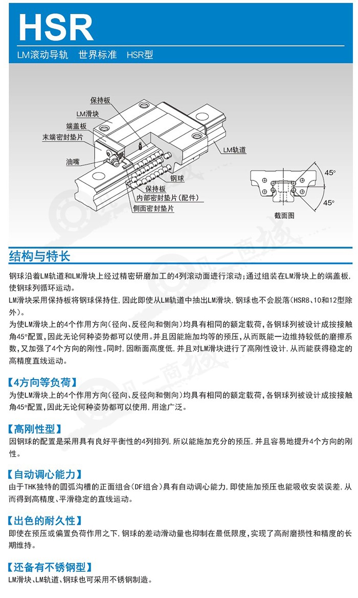 LM軌道與LM滑塊的被精密研磨加工過的4列滾動溝槽上球進行滾動,再通過裝在LM滑塊上的端蓋板,使各列球進行循環運動。 因球被保持板保持,即使將LM 滑塊從LM 軌道上抽出,球也不會脫落。(HSR8 10 12 型除外)。 為了使LM 滑塊的4 個方向(徑向方向、反徑向方向、橫方向)具有相同的額定負荷,各球列被設計成45 °的接觸角,無論使用何種姿勢都可以。并且因能施加均等的預壓,從而既能一邊維持較低的摩擦系數,又加強了4個方向的剛性。同時、因斷面高度低、且對LM滑塊進行了高剛性設計,因而可以獲得穩定的高精度直線運動。