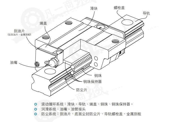 2、滑塊,導(dǎo)軌材質(zhì)提供不銹鋼及合金鋼兩種。不銹鋼材質(zhì)的直線導(dǎo)軌,包含滑塊,導(dǎo)軌及其它金屬配件,如鋼珠,保持器等,皆使用不銹鋼材質(zhì),具備防銹的特性。