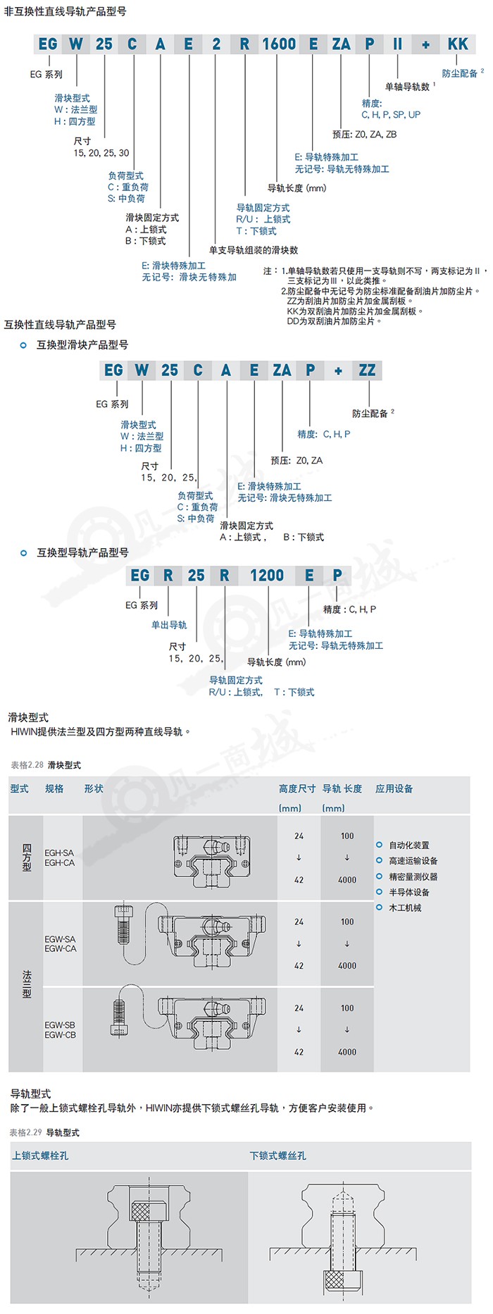 EG系列使用四列鋼珠承受負(fù)荷設(shè)計(jì),使其具備高剛性、高負(fù)荷的特性,同時(shí)具備四方向等負(fù)載特色、及自動(dòng)調(diào)心的功能, 可吸收安裝面的裝配誤差,得到高精度的訴求。 加上降低組合高度及縮短滑塊長度,非常適合高速自動(dòng)化產(chǎn)業(yè)機(jī)械及空間要求的小型設(shè)備使用。